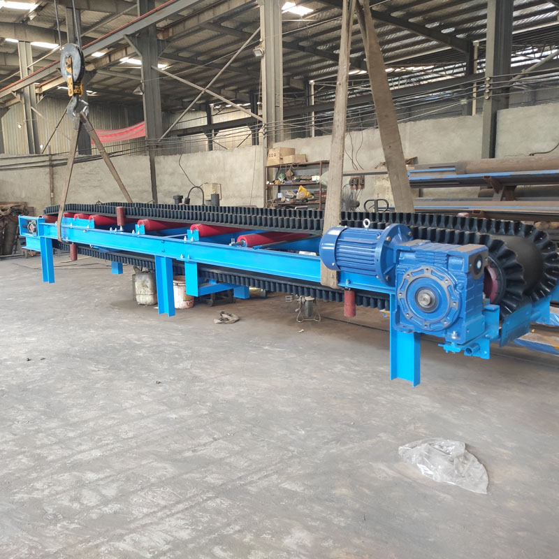 刮板清掃裝置裝在膠帶輸送機正,反表面,有皮帶自動張緊裝置以保證輸送皮帶恒定張力。