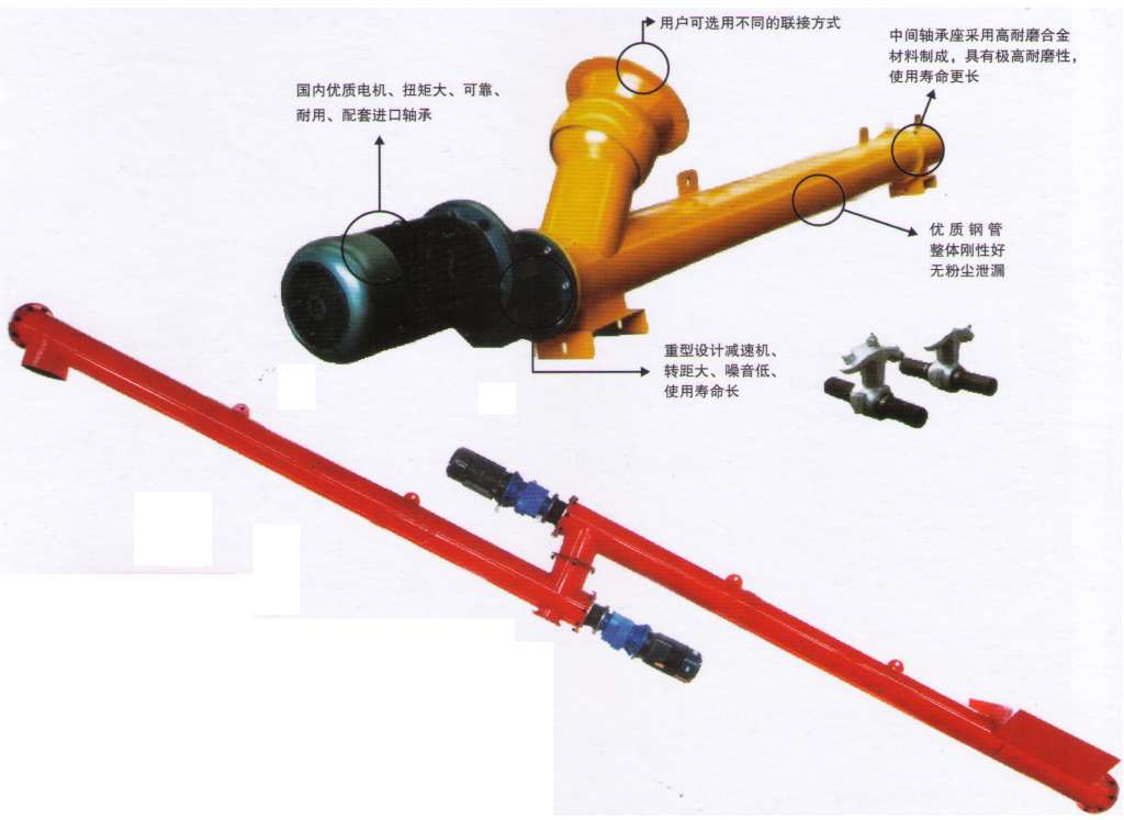 螺旋體積小、轉速高、輸送量大,結構新穎,技術先進,整機噪音低、適應性強、操作維修方便,進出料口位置布置靈活。選用優質鋼整體剛性好、承載能力大,全封閉密封性能好、無粉塵泄露、安全可靠,是新一代最理想的環保產品。