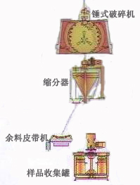 該系統主要由旋斗式中部采樣機、初級樣品給料機、錘式破碎機、次級樣品給料機、次級采樣機(縮分器)、樣品收集器、余料處理設備、電氣控制系統、鋼結構支架、系統溜管等組成。