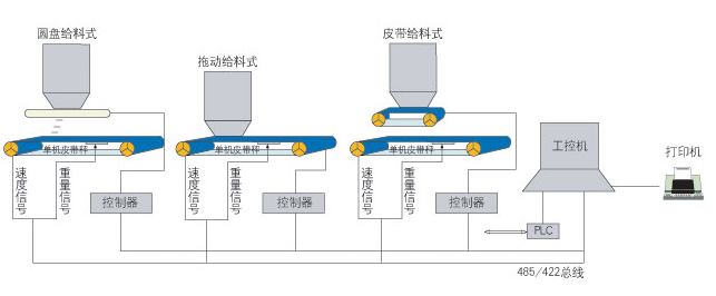 圓盤給料機或其它上位輸送機輸送物料到單機皮帶秤,單機皮帶秤的重量信號,速度信號通過接口模塊或PLC可編程控制器,送至工控機,由系統軟件進行處理和顯示,同時,利用PLC中的PID調節功能并根據用戶設定的PID參數及理想控制值,通過PLC迷你量輸出模塊輸出4~20mA電流到電機控制器,并由其調節給料機速度快慢,從而達到控制給料量的目的。