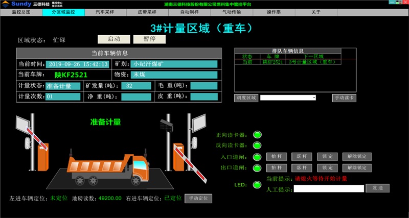 計量無人值守:通過道閘、聲音、燈光信號引導車輛上磅,并自動獲取地磅稱重信息,完成計量操作后,由LED和語音播報出計量數據,并由智能調度系統對車輛進行調度,引導車輛進入下一區域,完成車重的全自動計量。