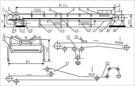 1、傳動(dòng)滾筒;2、頭罩;3、輸送帶;4、槽型調(diào)心 托輥;5、槽型托輥;6、緩沖托輥;7、導(dǎo)料槽;8、螺旋拉緊裝置;9、改向滾筒;10、尾架;11、空段清掃器;12、下平調(diào)心托輥;13、下托 輥;14、中間架;15、中間支腿;16、改向滾筒;17、頭架;18、彈簧清掃器;19、垂直拉緊裝置;20、犁式卸料器;21、卸料車;22、車式拉 緊裝置
