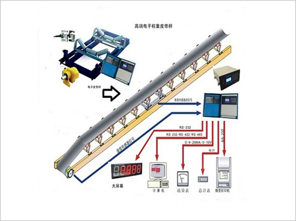 當物料通過時,電子皮帶秤計量段上物料的重量作用于稱重傳感器上,產生一個正比例皮帶載荷的毫伏信號,同時速度傳感器提供正比例皮帶速度脈沖信號,這兩路信號同時進入稱重儀表,稱重儀表內部將這兩種信號進行放大、濾波、A/D轉換后送入CPU進行積分運算,然后將物料的瞬時流量和累計重量在顯示面板上顯示出來。稱重儀表具有可選的聯網、通訊、打印、DCS聯機等功能。