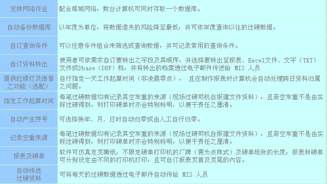 此電腦過磅系統提供絕佳的品質與精準的測量,必定能滿足客戶的秤重需求。我們也提供優質的磅料機,太空包計量包裝磅秤,定量包裝機,定量包裝磅秤,遞減式定流量供料磅秤,油壓拖板車秤等產品。TWM(TruckWeighing Master )即是電腦卡車過磅管理系統,為配合電子重量顯示器與電腦連線,自動傳送重量資料,以處理卡車過磅作業并應用其過磅資料統計日報表、期報表及各類資料分析統計報表。