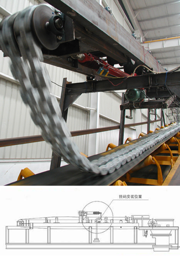工作原理:循環鏈碼安裝于電子皮帶秤的正上方,輸送機空載運轉時,封閉鏈碼圈平穩放置在運輸皮帶上,覆蓋整個皮帶秤稱量區域;由輸送機帶動鏈碼圈轉動,反復循環稱重,模擬輸送實料狀態,從而完成動態校準。校準完成后,由升降系統將鏈碼圈提升一定高度,并不妨礙皮帶輸送機運輸物料。