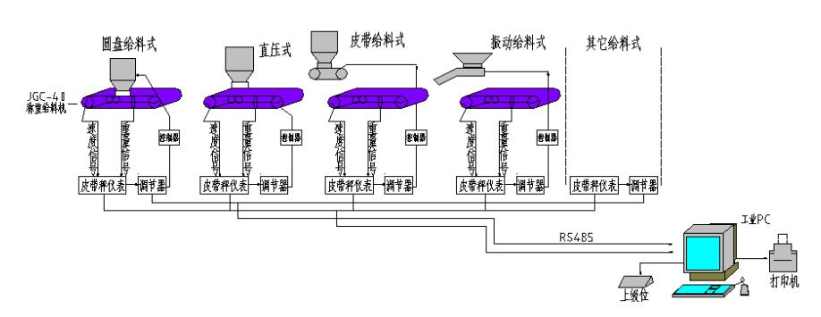 DCS自動集散式配料系統主要由JGC系列稱重給料機(配料秤)、稱重顯示控制器、可編程控制器、電氣控制系統、工業控制計算機和系統軟件等組成;該系統采用通用的工業計算機人機交互界面形式,它具有數據采集、控制、報警、圖形和數據顯示等功能。根據設定要求完成物料的配比控制以及生產過程中各種數據管理。
