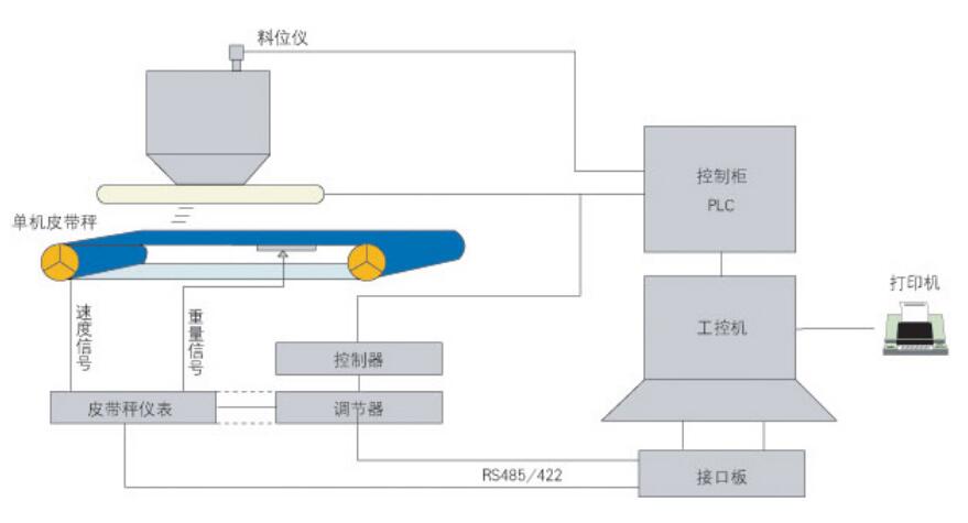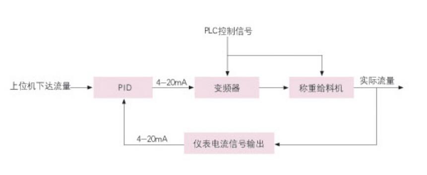 同時稱重儀表輸出一個與流量成正比的電流信號(4~20mADC或0~20mADC)給智能單回路調節器,智能單回路調節器根據用戶設定的PID參數及自整定方法運算出控制電流(4~20mADC)給變頻調速電機,從而調節皮帶運行速度,達到穩定控制給料量的目的。